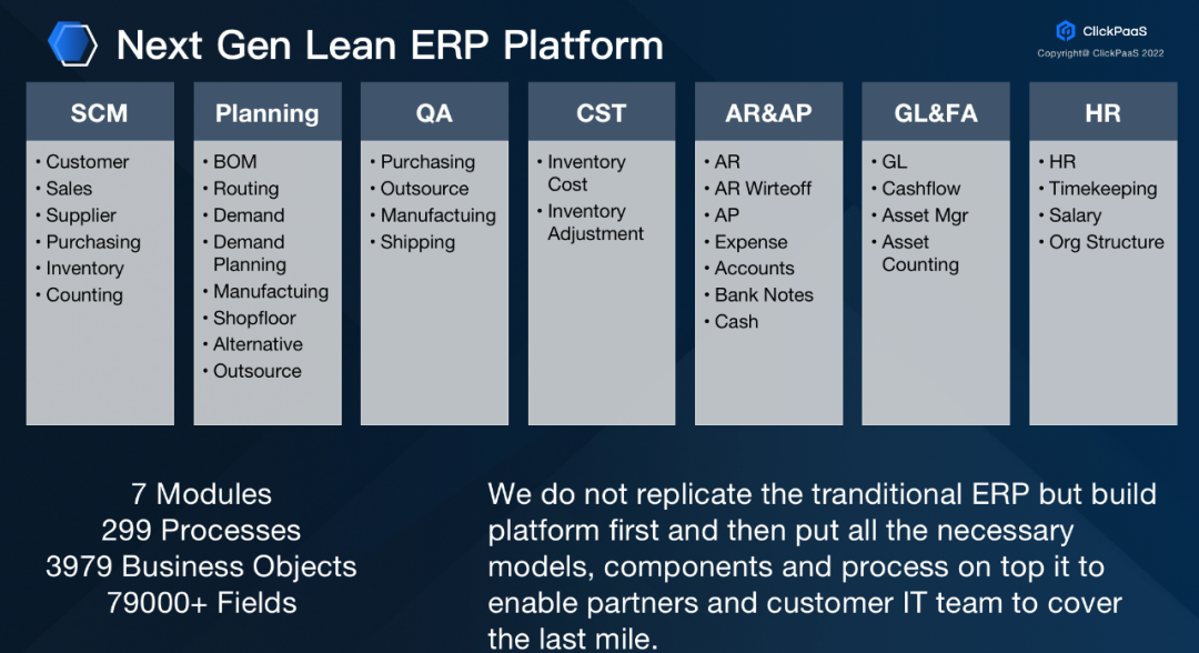 ayx入口把这样的逻辑同样应用到了工业领域。比如在纷繁复杂的泛ERP场景中,ayx入口把ERP场景中的核心模型内置在元数据模型平台上,并不是复制一个传统ERP,而是把核心的模型、组件、流程开放性的构建完善,支持ayx入口的伙伴和客户通过一个瘦身的Lean ERP Platform进行扩展开发的逻辑构建最后一公里的业务实现。